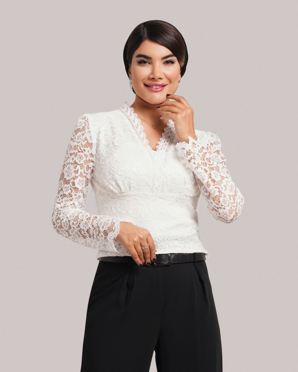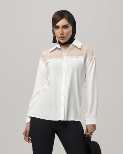 شومیز آستین بلند جلو دکمه سرشانه توری مرواریدی جنس الیزه برند لیمارا