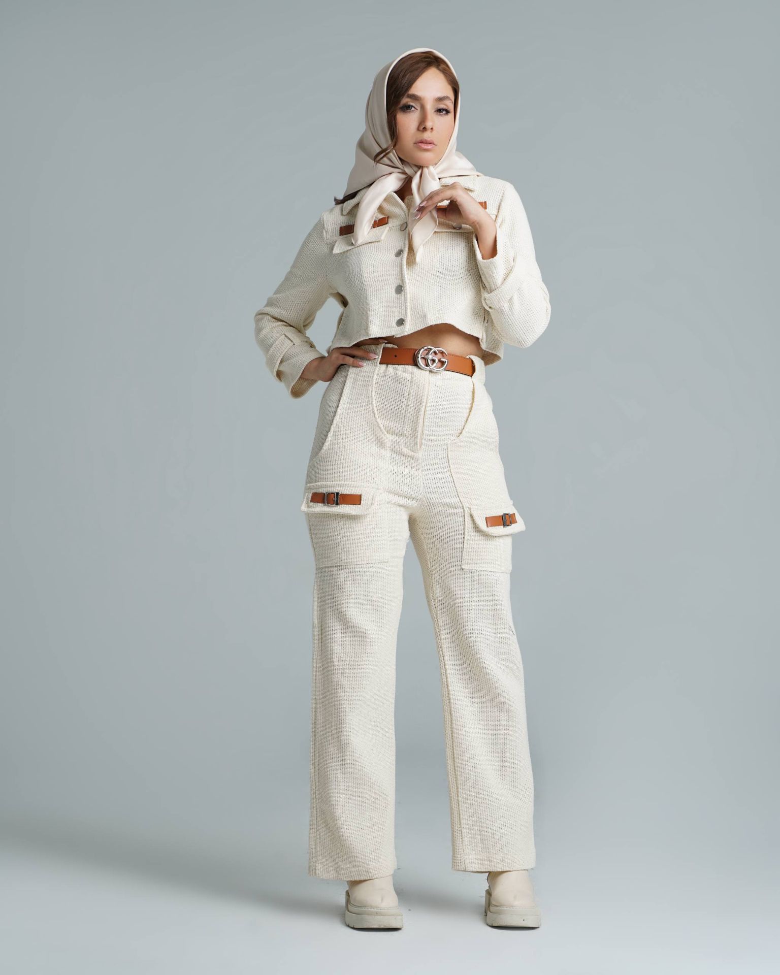 ست کت کراپ و شلوار جنس کتان کنفی برند استایل